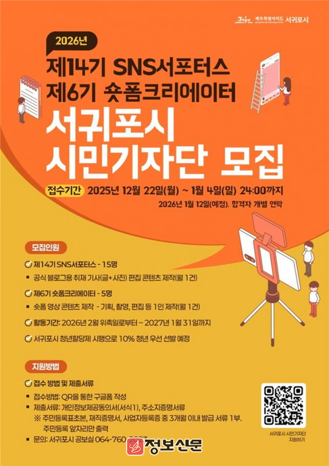 모집 대상은 SNS서포터스 15명, 숏폼크리에이터 5명 등 총 20명 내외로, 서귀포시의 정책·행사·문화·관광 등 다양한 시정 소식을 시민의 시선으로 콘텐츠를 제작하게 된다, 모집 기간은 2025년 12월 22일부터 2026년 1월 4일까지이며, 지원은 온라인 구글폼을 통해 가능하다. 최종 합격자는 2026년 1월 12일 개별 통보할 예정이다.
