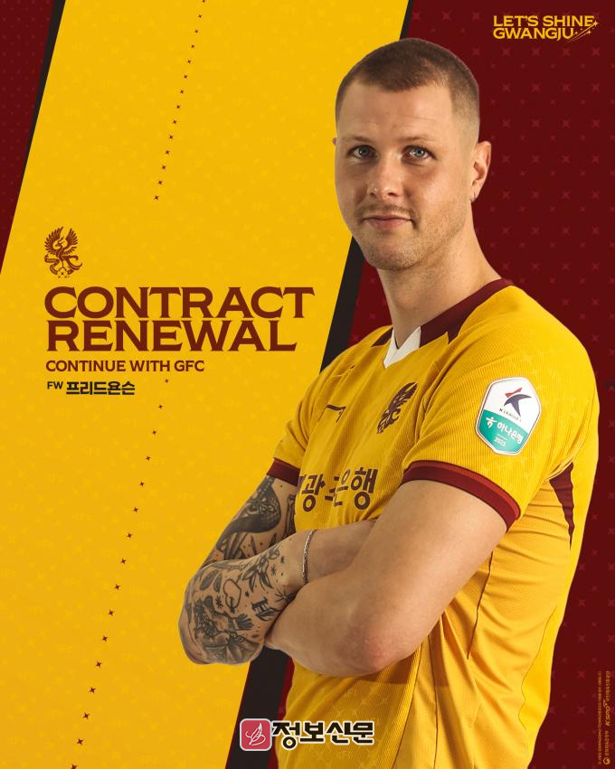 프리드욘슨은 “광주에서 다시 한번 신뢰를 받게 돼 큰 책임감을 느낀다”며 “내년에는 더 많은 득점을 목표로 해 팀에 보탬이 되겠다”고 소감을 밝혔다.