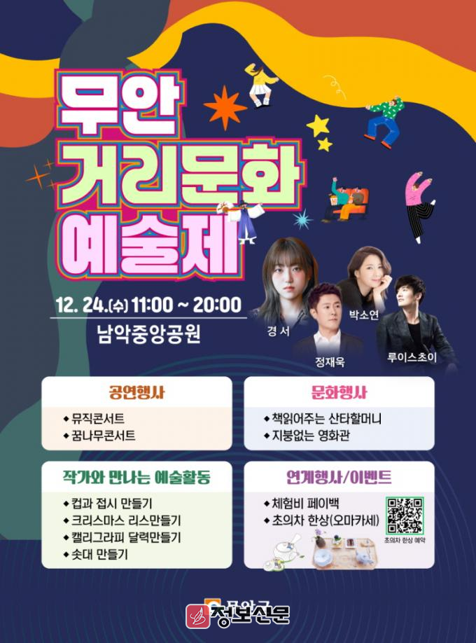 김산 군수는 “이번 예술제를 통해 무안의 다양한 거리 예술의 매력을 널리 알리고, 예술을 사랑하는 이들에게 특별한 연말 추억을 선물하고자 한다”며, “가족, 친구, 연인과 함께 남악 중앙공원에서 예술로 물드는 뜻깊은 시간을 보내시길 바란다”고 말했다.