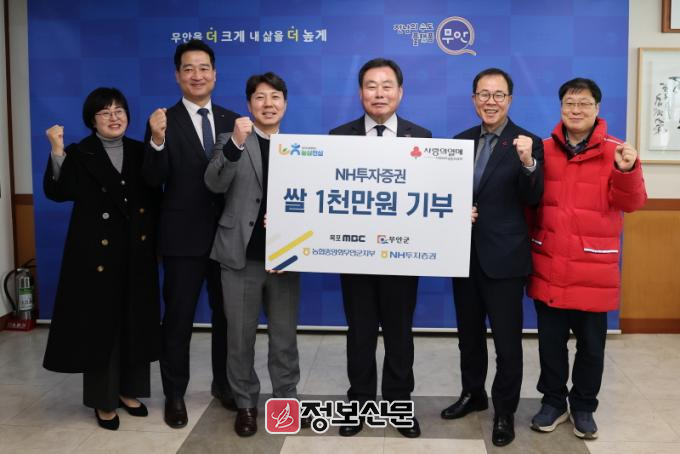 이날 기탁식에는 김산 군수를 비롯해 NH투자증권 전민경 이사, 목포MBC 김순규 대표이사, NH농협 무안군지부 박상덕 지부장, 전남사회복지공동모금회 오세헌 부장 등 관계자들이 참석해 지역사회 이웃사랑 나눔의 의미를 함께 하였다.