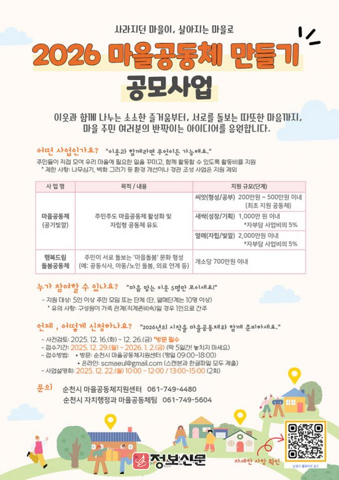 ![]() 순천시, 2026년 ‘마을공동체 만들기’ 공모사업 참여 공동체 모집 |