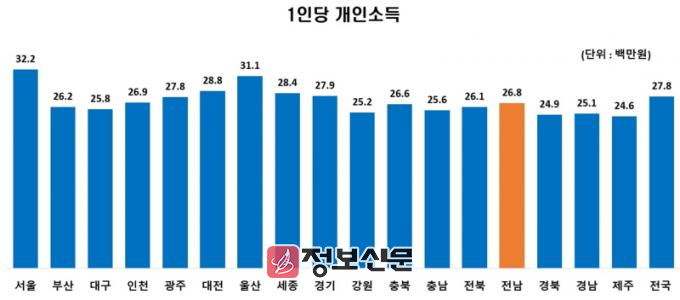 ![]() 전라남도, 1인당 총생산 전국 4위·1인당 개인소득 8위 |