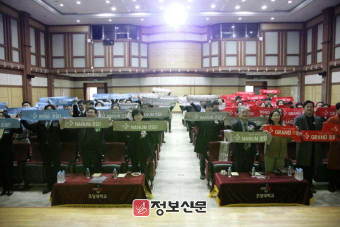 ![]() 초당대학교 총장 및 교직원, 외빈들이 ‘전남과 상생하는 초당RISE’, ‘GRAND 초당’, ‘NANUM 초당’을 주제로 한 RISE 세리모니를 하고 있다. |
