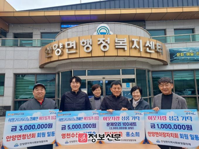 안양면청년회(회장 마현주)는 회원들의 자발적인 참여로 모은 성금 300만원을 전달하며, 지역사회를 향한 청년들의 책임과 연대를 실천했다. 청년회는 봉사활동 뿐만 아니라, 다양한 지역 행사에도 적극 참여하며 지역 발전을 위한 중심 역할을 하고 있다.