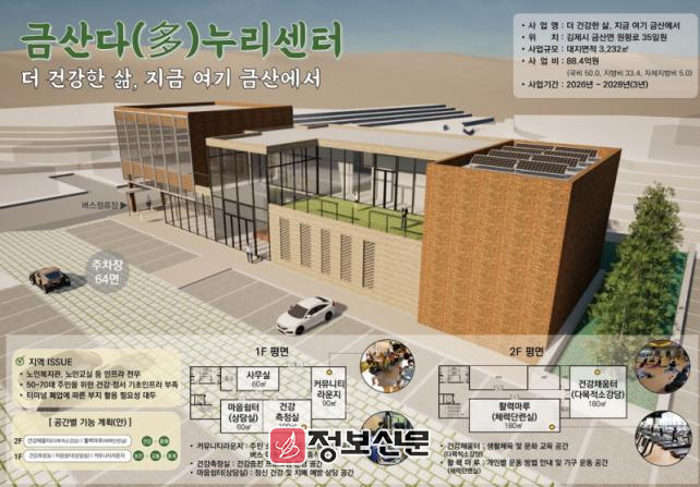 시는 이번 사업을 통해 주민의 건강과 정서 복지를 통합적으로 지원하는 기초 인프라를 구축하기 위해 금산면 원평로 35 일원(옛 원평공용버스터미널)에 내년부터 오는 2028년까지 3년간 총 88.4억원을 투입해 지상 2층 규모의 금산 다(多)누리센터를 건립할 예정이다.