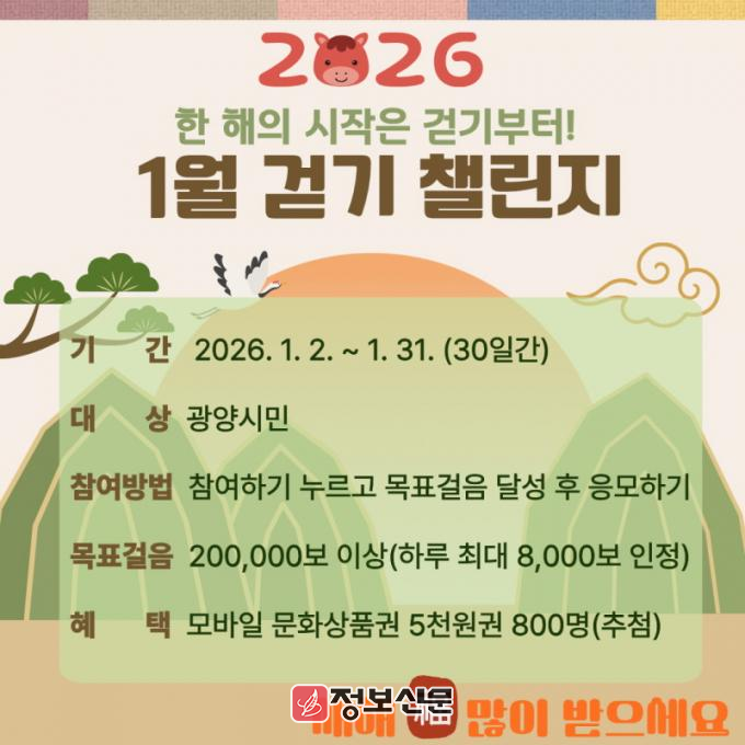 ![]() 광양시, 워크온 한 해의 시작은 걷기부터! 1월 걷기 챌린지 운영 |
