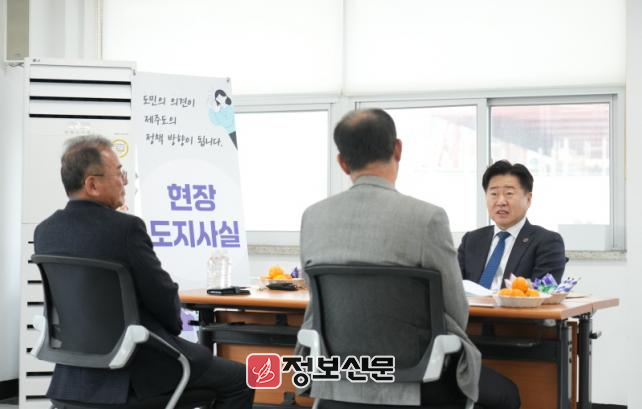 지난 11월 한림읍(서부)과 구좌읍(동부), 12월 이도2동·노형동(북부)에 이어 다섯 번째로 마련된 이날 현장 도지사실은 서귀포시를 포함한 남부권역 주민들의 관심 현안을 직접 챙기기 위해 이뤄졌다.