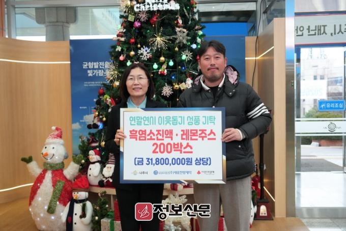 나주시(시장 윤병태)는 농업회사법인 ㈜새롬한방제약(대표이사 박경혜)이 관내 사회복지시설과 취약계층 지원을 위해 흑염소 진액과 레몬주스 200세트, 3180만 원 상당의 건강식품을 기탁했다고 29일 밝혔다.