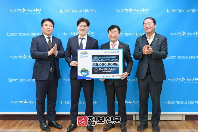 ![]() ▲ 한성모터스(주) 순천전시장(지점장 김선근)이 지난 30일 연말을 맞아 지역사회에 온정을 전하기 위해 여수시 「희망2026나눔캠페인」에 성금 500만 원을 기탁했다.