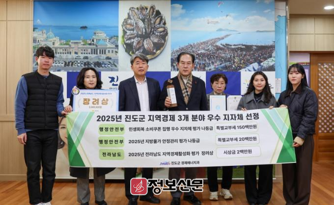 진도군은 ‘민생회복 소비쿠폰 집행 우수 지방자치단체 평가’를 비롯한 지역경제 3개 분야 평가에서 우수 기관으로 선정되며, 특별교부세 1억 7천만 원과 시상금 2백만 원을 확보했다.