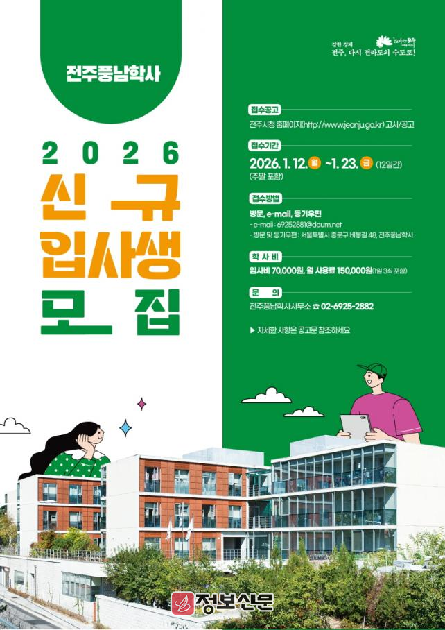 ![]() 전주시, 2026년 전주풍남학사 신규입사생 모집 |
