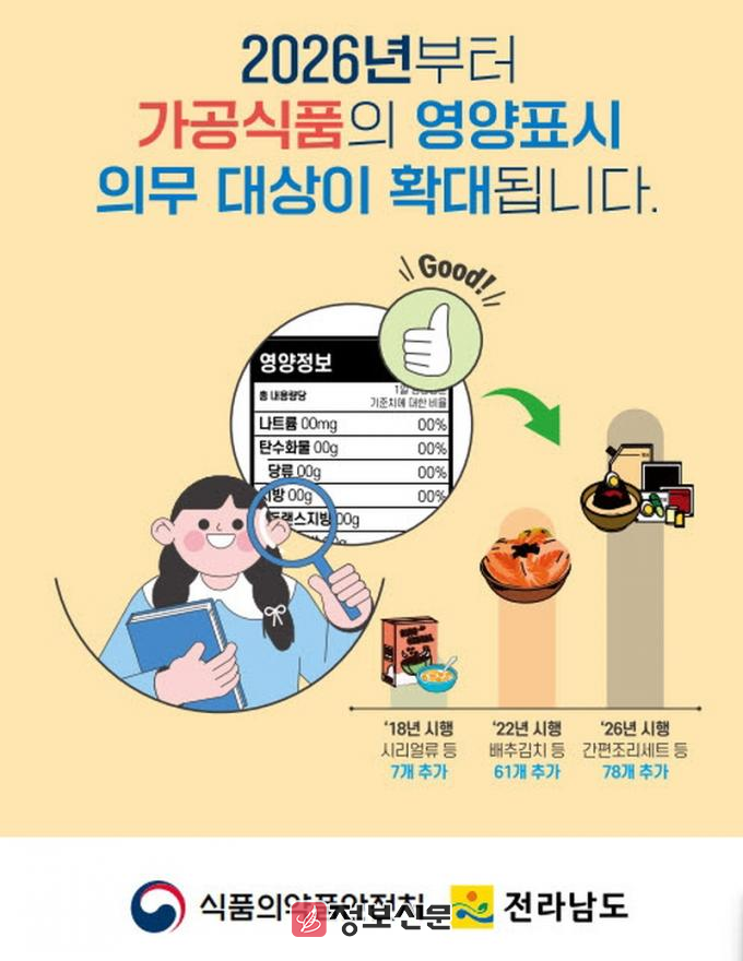 영양성분 표시 확대 시행으로 기존 포장재 사용이 어려운 경우 포장지 연장 사용 신청이 가능하며, 관련 절차는 전남도(061-286-6592)를 통해 안내받을 수 있다.