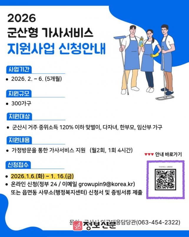 군산시는 총 300가구를 모집할 예정이며, 선정된 가정은 월 2회, 5개월간 가사서비스를 이용할 수 있다. 신청 기간은 2026년 1월 6일부터 16일까지이며, 정부24나 담당 부서 대표 메일(growupin9@korea.kr) 또는 주소지 읍·면·동 행정복지센터를 방문해 접수해도 된다.