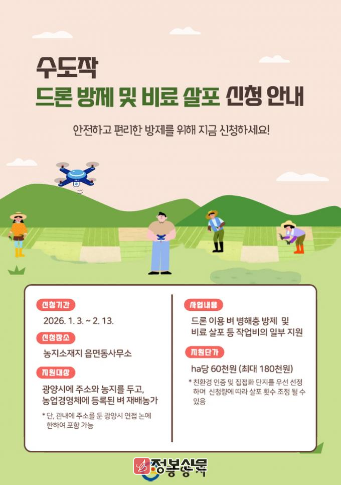 신청 대상은 광양시에 주소와 농지를 두고 벼를 재배하는 농업경영체로, 신청 기간은 2026년 1월 5일부터 2월 13일까지이며 지원을 희망하는 농업인은 기간 내 농지소재지 읍·면·동사무소에서 신청하면 된다.