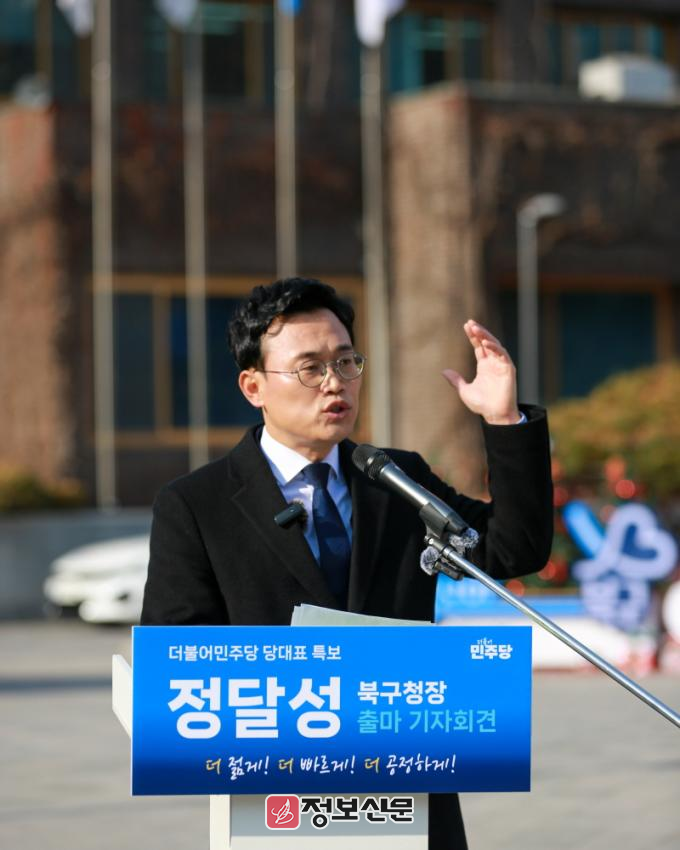 정달성 특보는 5일 북구청 앞에서 열린 출마 선언 기자회견에서 “북구는 인구감소와 초고령화, 기후재난, 기술혁신이라는 대전환의 시대 한가운데 서 있다”라며 “기존의 방식으로는 이 위기를 넘을 수 없고, 지금 북구에는 판을 바꾸는 과감한 혁신이 필요하다”라고 밝혔다.