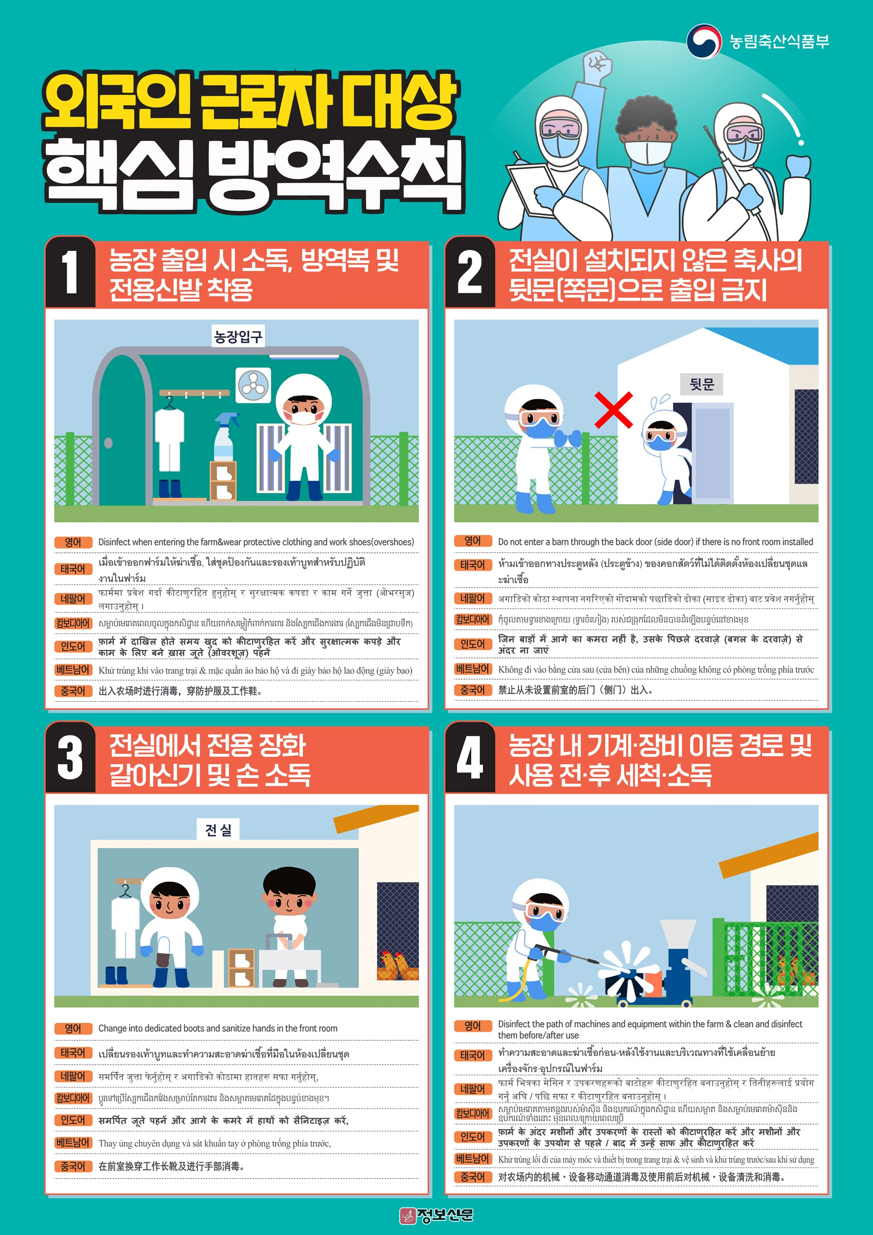 이에 따라 도는 외국인 근로자를 통한 바이러스 유입 가능성을 차단하기 위해 입국 후 5일간 농장·축사 출입을 제한하고, 불법 축산물 반입 금지 서약서 징구와 방역 교육을 강화할 방침이다. 농장 출입 시에는 환복과 전용 장화 착용, 신발·의복·소지품 소독 등 기본 방역 수칙을 철저히 이행하도록 지도한다.