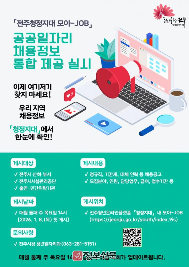 이에 시는 분산된 각 기관별 채용공고를 취합·정리 후 오는 8일부터 매월 둘째 주 목요일 오후 2시, 전주청년온라인플랫폼 ‘청정지대’(youth.jeonju.go.kr) 내 ‘모아-JOB’ 게시판에 게시함으로써 구직활동에 어려움을 겪는 청년들이 공공부문 채용 정보를 쉽고 빠르게 확인할 수 있도록 지원할 계획이다.