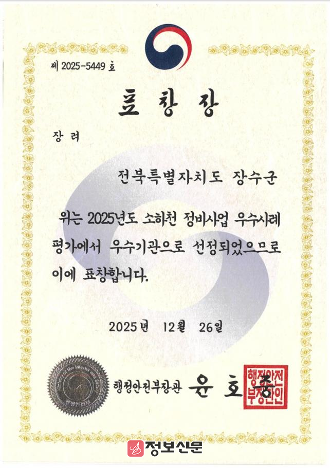 ![]() 장수군, ‘2025년 소하천 정비사업 우수사례 공모전’ 장려상 수상 |