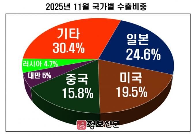 국가별 수출은 일본 1억 9천527만 달러, 미국 1억 5천483만 달러, 중국 1억 2천538만 달러 순이었다. 중국 수출액 가운데 김 비중은 37.0%, 수출액은 4천683만 달러를 기록하며 2024년보다 64.8% 증가했다.