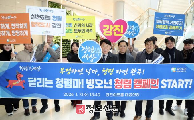 이번 청렴캠페인은 지난 7일 ‘2026년 시무식 및 Connect 강진 선포식’ 행사 속에서 함께 진행됐으며 강진원 군수를 비롯한 공직자들이 청렴 실천 의지를 다지는 뜻깊은 자리로 마련됐다.