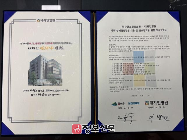 ![]() 장수군, 대자인병원과 심뇌혈관질환 대응 진료협력 협약 체결 |