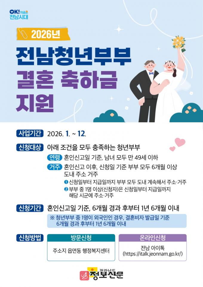 청년부부 결혼축하금 지원사업은 전남도가 2021년 전국 광역시·도 최초로 시행했다. 지원 대상은 혼인신고일 현재 49세 이하 부부다. 신청일 직전까지 전남에 6개월 이상 주소를 둬야 한다. 혼인신고 후 6개월이 지난 날부터 1년 6개월 이내 신청 가능하며, 신청한 달의 다음 달 15일에 받을 수 있다.