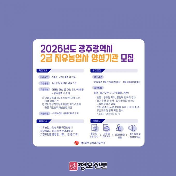 광주시는 서류·현장심사와 심의위원회 의결 등을 거쳐 상반기 중 양성기관을 지정할 계획이다. 신청 자격과 지정 일정 등 자세한 사항은 농업기술센터 누리집(www.gwangju.go.kr/agri/)의 농업소식 게시판에서 확인할 수 있다.