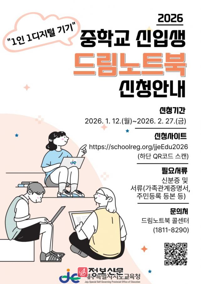 드림노트북 신청 대상은 2026학년도 도내 중학교(특수학교 포함) 입학 예정 신입생으로 내달 27일까지 온라인 신청 사이트(https://schoolreg.org/jjeEdu2026)를 통해 직접 신청하면 된다.