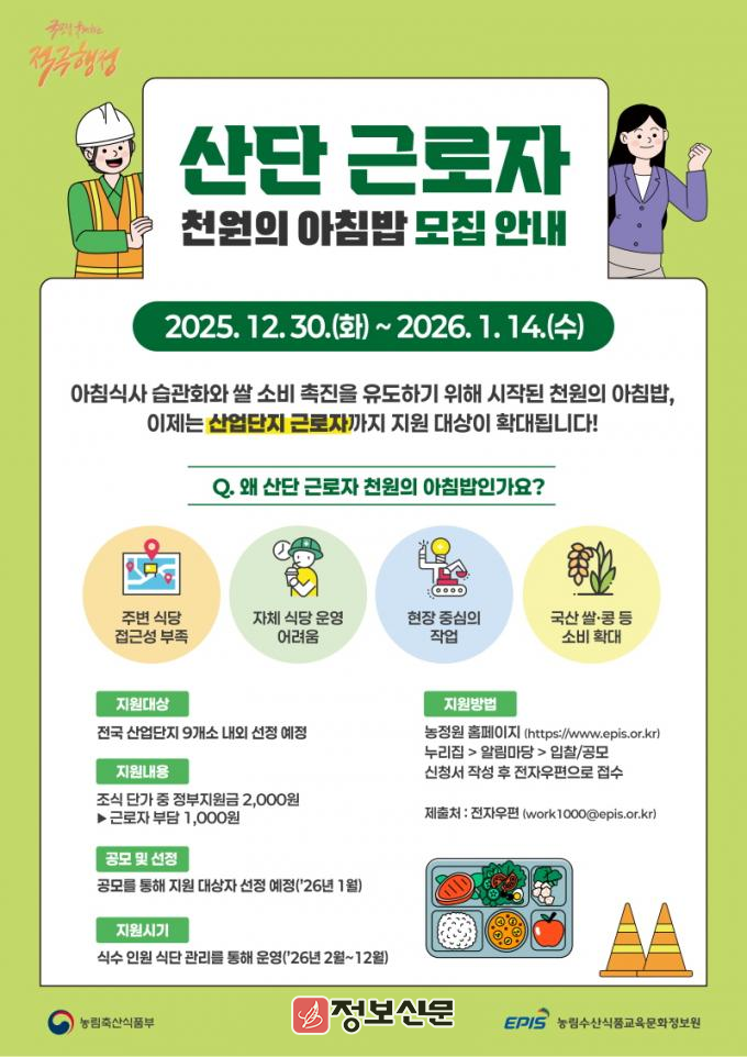 ![]() 전라남도, 중소기업 근로자 천원의 아침밥 및 든든한 점심밥 지원사업 추진 |