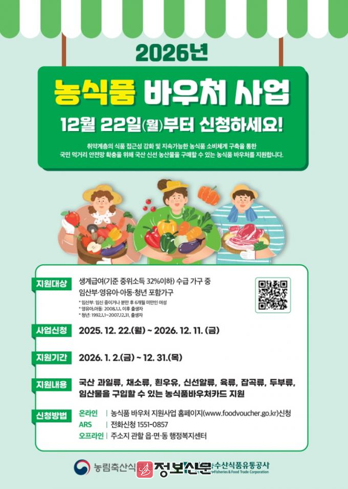 신청은 주민등록 주소지 기준 읍·면·동 행정복지센터와 농식품 바우처 누리집(www.foodvoucher.go.kr), 또는 ARS(☎1551-0857)를 통해 가능하다.