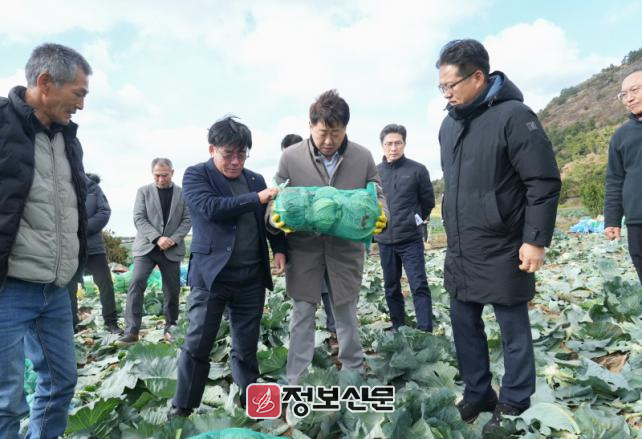 오영훈 지사는 양배추 수확 현장도 직접 찾아 생육 상태와 수확 상황을 점검하며 농가 의견을 청취하고, 현장의 어려움과 정책적 보완 필요 사항을 꼼꼼히 살폈다.