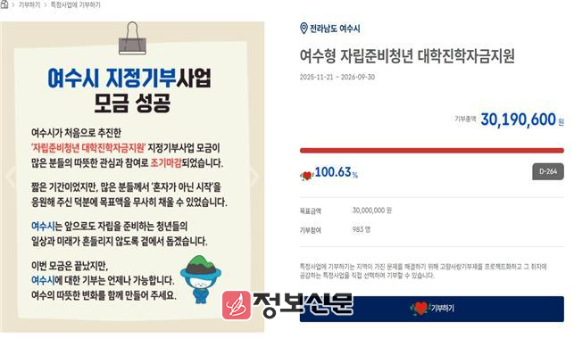 ![]() 여수시, 2025년 고향사랑기부금 14.9억 원 달성! 도내 모금액 3위 등극 |