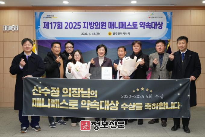 ![]() 광주광역시의회 신수정 의원, 2025년 지방의원 매니페스토 약속대상 5관왕 달성 |