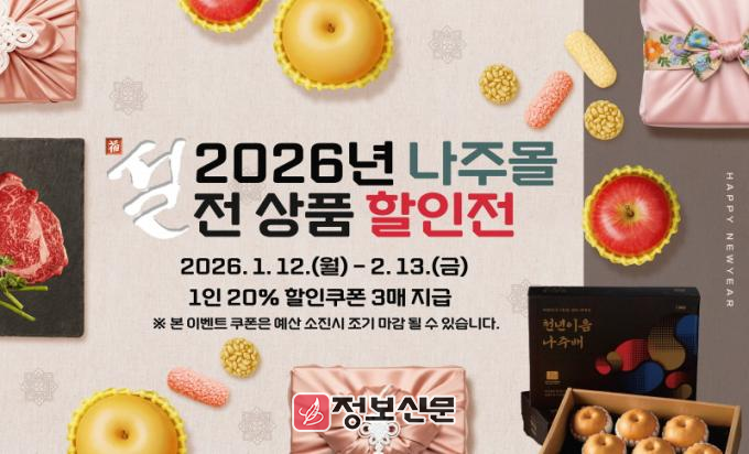 나주시(시장 윤병태)는 2025년 연 매출 16억 원을 달성하며 역대 최고 매출을 기록한 나주몰에서 설 명절을 앞두고 오는 2월 13일까지 ‘2026년 나주몰 설 명절 기획전’을 진행한다고 14일 밝혔다.