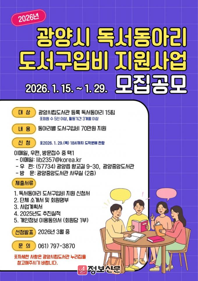 ![]() 광양시, 2026년 독서동아리 도서구입비 지원사업 모집 |