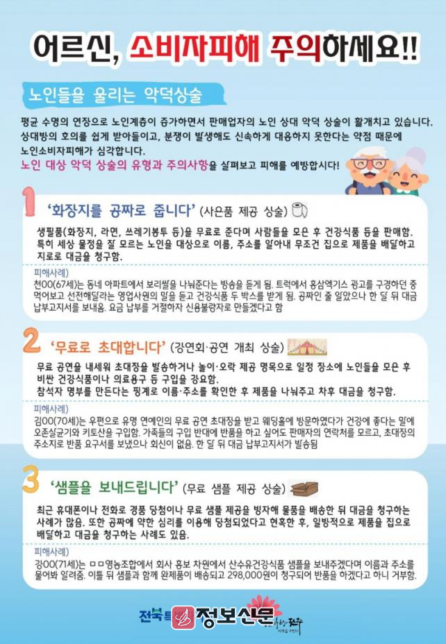 한편, 방문판매법 위반에 따른 소비자 피해가 발생할 경우에는 관련 증거자료와 함께 소비자상담센터(국번 없이 1372) 또는 공정거래위원회(1670-0007), 전주시(완산구청=063-220-5353, 덕진구청=063-270-6352, 민생사회적경제과=063-281-2373)로 신고하면 도움을 받을 수 있다.