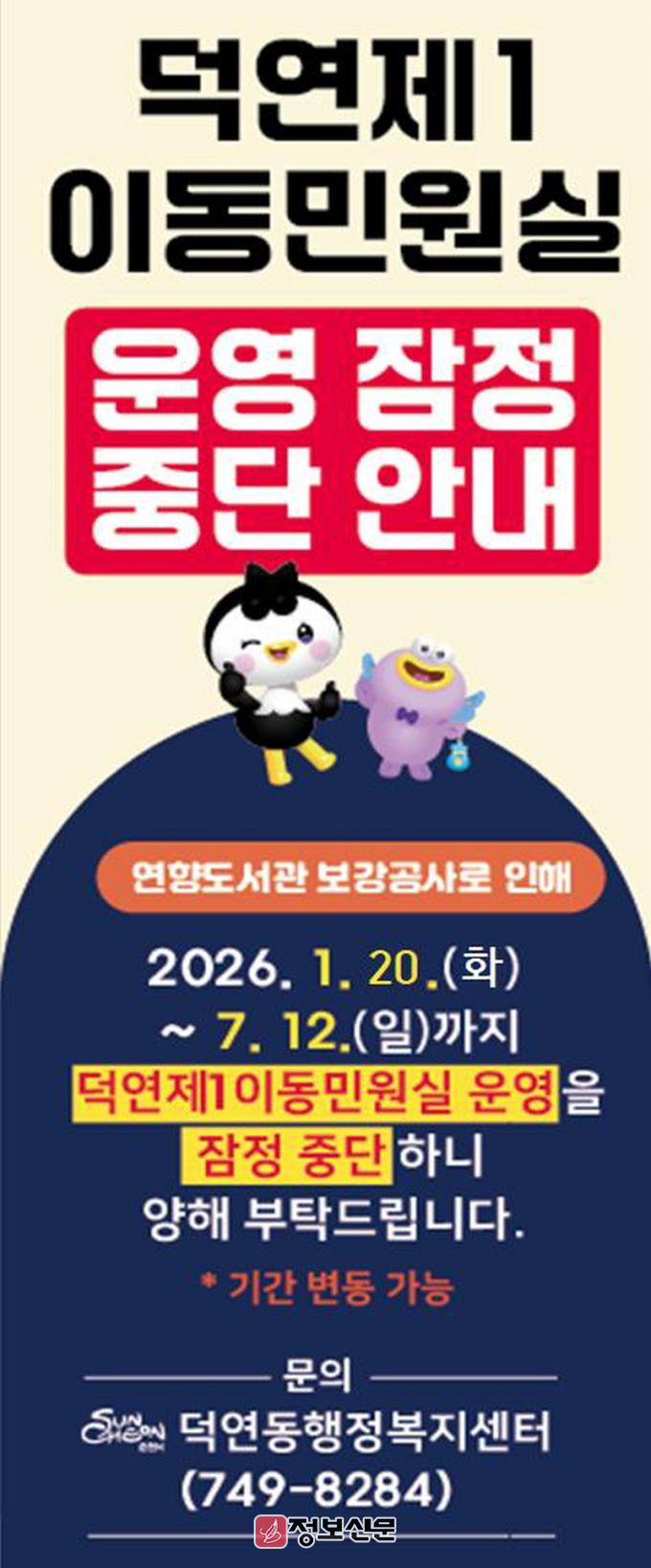 ![]() 순천시 덕연동, 제1이동민원실 1월 20일부터 운영 잠정 중단 |