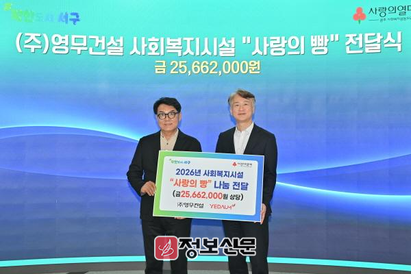 김이강 서구청장은 “정기적인 후원을 통해 따뜻한 나눔을 실천해 주신 ㈜영무건설에 깊이 감사드린다”며 “민관이 함께하는 이러한 나눔이 지역 복지안전망을 더욱 촘촘하고 단단하게 만드는 큰 힘이 될 것이다”고 전했다.