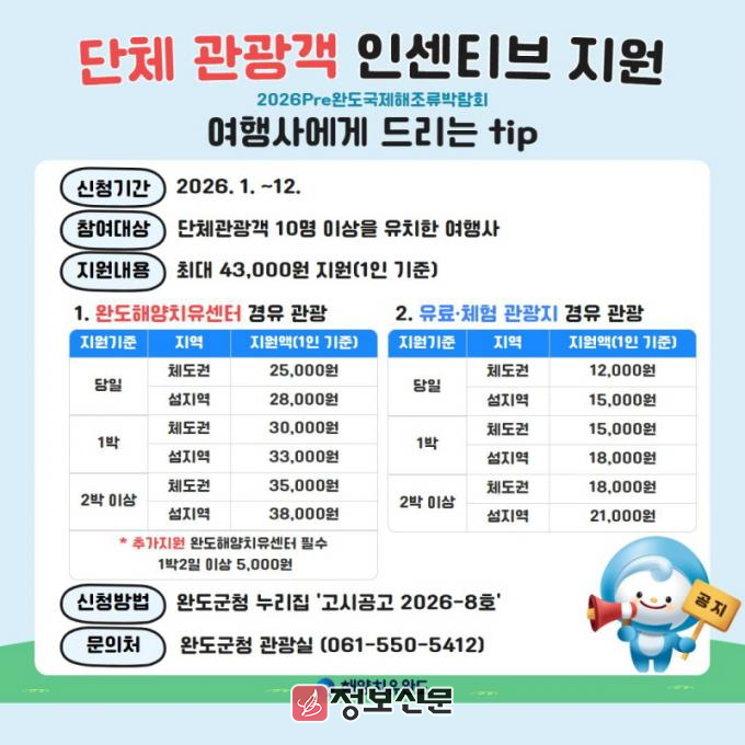 ![]() 완도군, 단체 관광객 유치 여행사 인센티브 확대 |