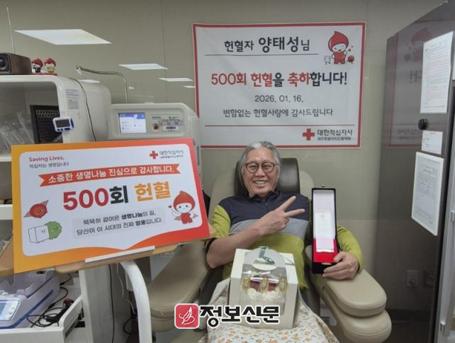 ![]() 대한적십자사 제주특별자치도혈액원, 양태성 헌혈자 500회 헌혈 달성 |