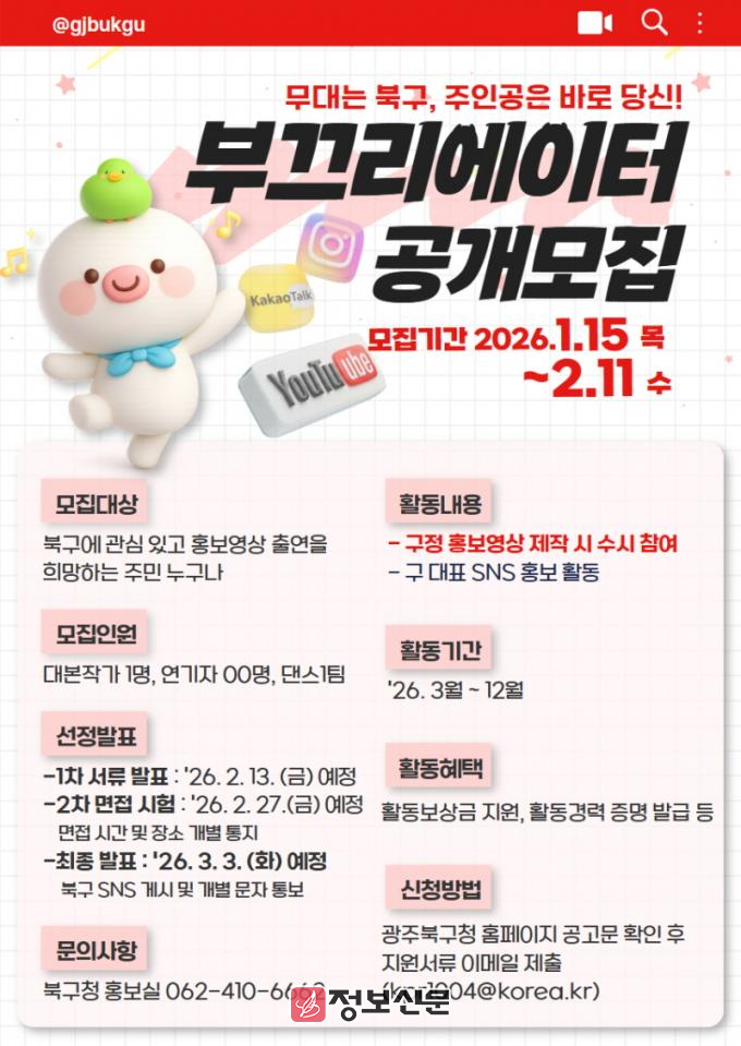 ![]() 광주광역시 북구, 주민 참여 구정 홍보단 ‘부끄리에이터’ 모집 |