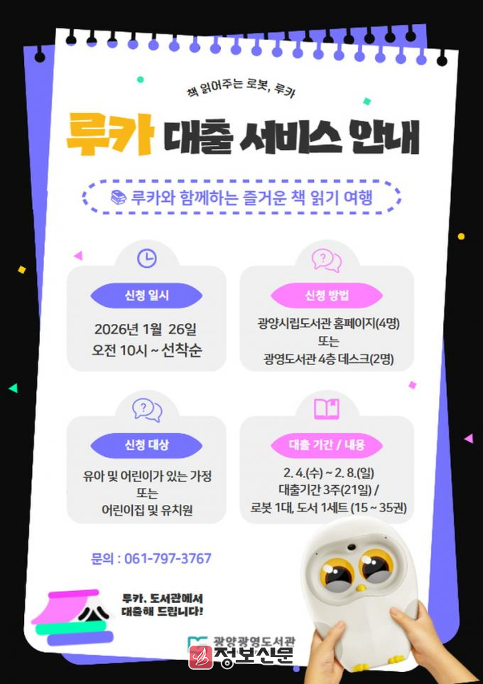 광양시 관계자는 “책 읽어주는 로봇 루카 도서 대출 서비스는 유아·어린이를 위한 대표적인 독서 지원 사업으로, 앞으로도 매년 상시 운영해 나갈 예정”이라며 “많은 가정과 보육·교육 기관에서 적극적으로 이용해 어린이 독서 문화 확산에 기여하길 바란다”고 말했다.