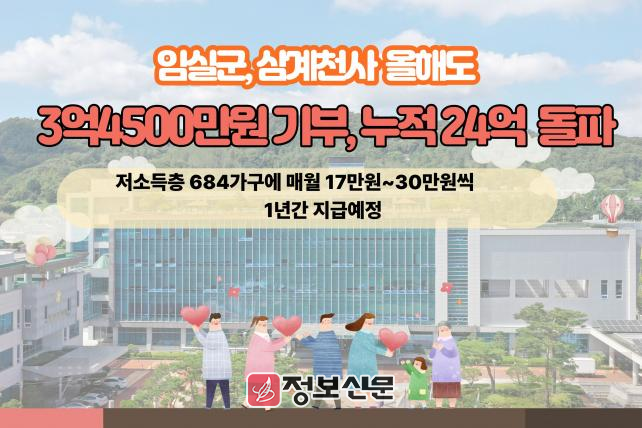 ![]() 임실군, 삼계천사 올해도 3억4500만원 통큰기부, 누적 24억 돌파 |