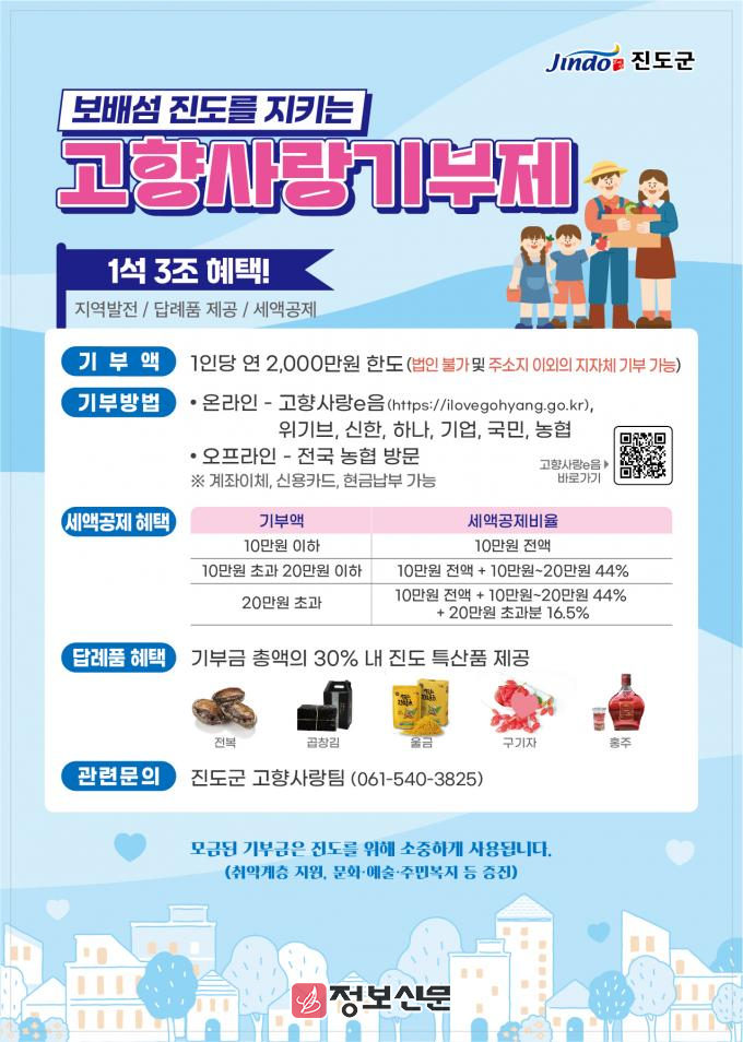 또한, 지난해부터 지정기부 사업으로 모금하고 있는 ‘보배섬 진도의 아이들을 지켜주세요’(진도군 지정병원 소아청소년과 의료진 인건비 지원)의 목표 달성을 위해 적극적인 홍보와 참여 확대에 나서고, 올해부터 고향사랑기부제 기부자에 대한 예우 강화를 통해 기부자와 진도군 간의 유대감을 높이고, 인구감소지역 대응에도 적극 나설 방침이다.