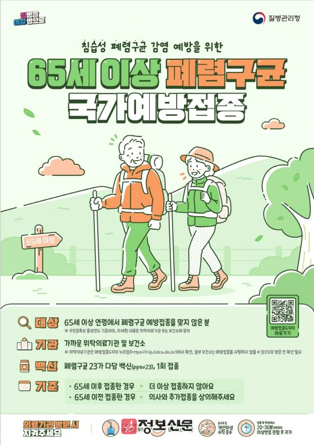 폐렴은 국내 사망 원인 중 높은 비중을 차지하는 질환이지만 65세 이상 연령대에서 평생 단 1회 접종만으로도 폐렴구균에 의한 침습성 감염증(패혈증, 뇌수막염 등)을 50~80%까지 효과적으로 예방할 수 있어 적기 접종이 무엇보다 중요하다.