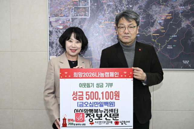 한편, 남원시는 지난 12월 1일부터 1월 31일까지 「희망2026 나눔캠페인」을 진행 중이다. 나눔 활동에 동참하고자 하는 개인이나 단체는 시청 주민복지과(☎ 063-620-6333)나 가까운 읍면동 행정복지센터에 연락하면 자세한 사항을 안내받을 수 있다.