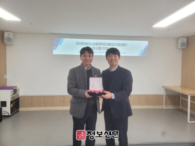 아동복지협회장 최모세 원장은 감사패를 전달하며“굿네이버스사회적약자통합지원센터는 지역 내 범죄 아동 및 가정을 위한 사회적 약자 지원에 항상 앞장서 왔다”며,“현장에서 체감할 수 있는 실질적인 도움을 아끼지 않은 점에 깊이 감사드리며, 앞으로도 긴밀한 협력을 통해 지역 아동과 사회적 약자를 함께 보호해 나가겠다”고 밝혔다.