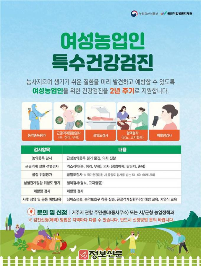 2026년 여성농업인 특수건강검진 지원을 희망하는 대상자는 주소지 읍·면·동사무소 산업팀을 방문해 신청하면 된다. 아울러 올해부터는 농업e지 앱을 통해 검진 신청자를 확인, 검진 예약일 확정, 검진 시 유의사항 안내 등을 제공할 예정이다.