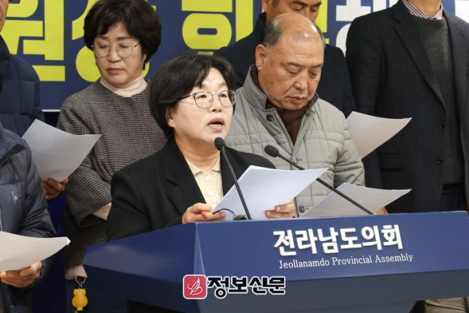 ![]() 지난 12월 10일, 도의회 브리핑룸에서 진보당·정의당 소속 도의원이 농민단체가 함께 ‘전남도지사는 사과하고, 벼 경영안정대책비를 원상 회복해야 한다’는 기자회견을 열었다.