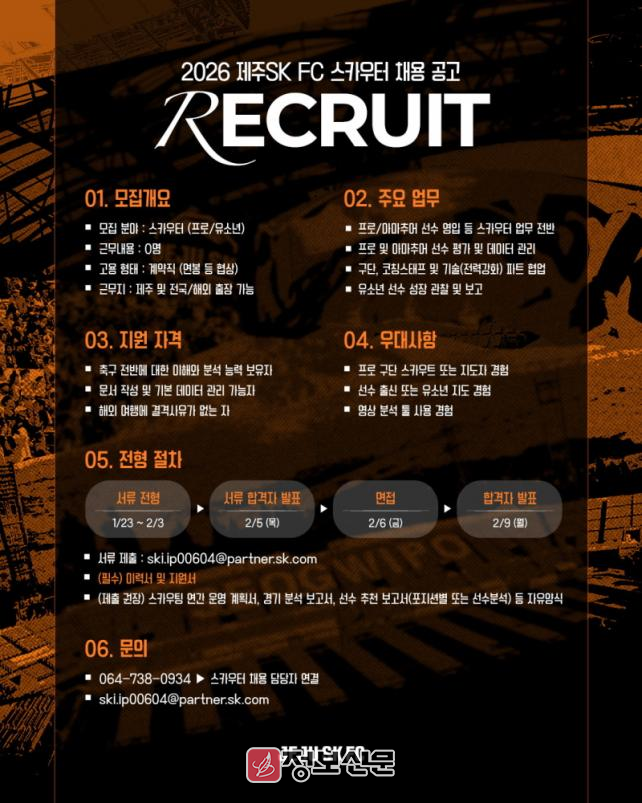 제주SK 관계자는 "이번 스카우트 공개 모집은 세르지우 코스타 감독 체제 하에서 선수 발굴 역량을 강화하기 위한 조치로, 구단은 축구 전문성과 현장 감각을 갖춘 전문가를 찾고 있다"며 적극적인 지원을 기다렸다.